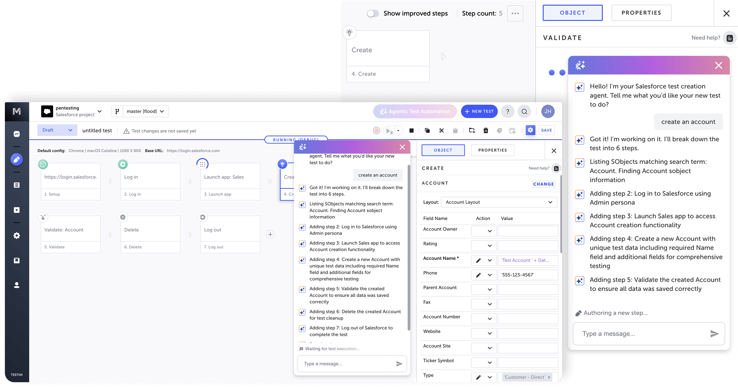 Through Agentic Test Automation, Testim Salesforce creates best-practice, complete tests by simply providing a description. Custom agents collaborate to construct tests and verify their correctness. The end result is fast, fully working tests without intervention.