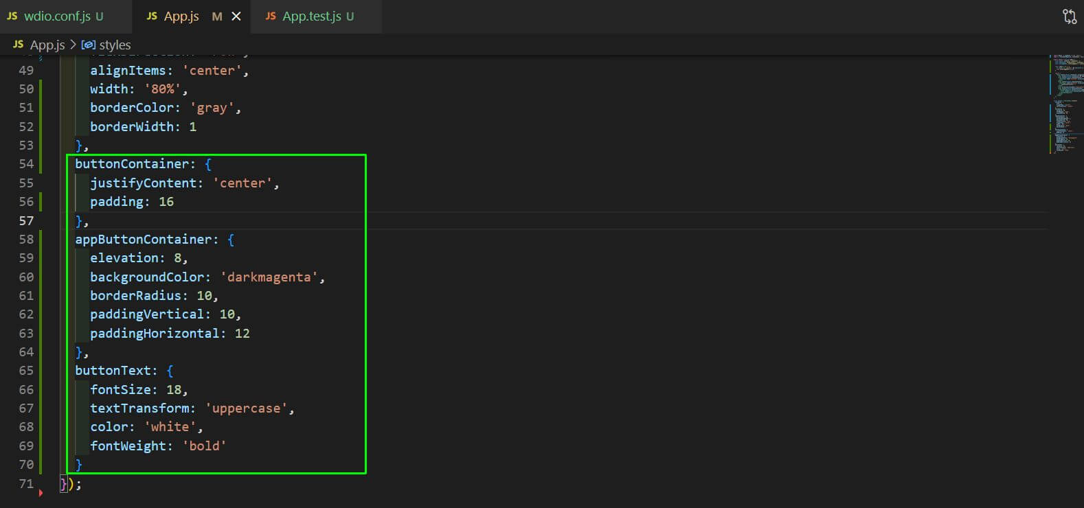 Now, let’s add styles in the App.js file. Here, we’ll first add the styles for the root container, title text, and the input containers.
