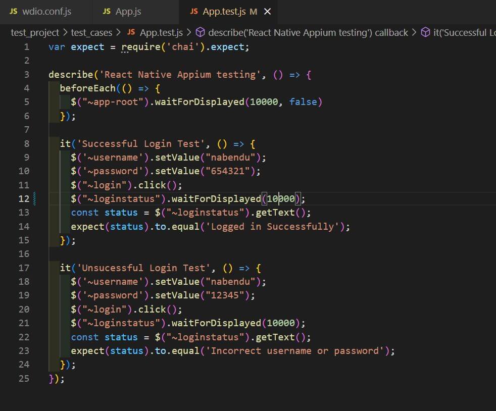Here, we’ll write our test cases with the Chai framework. The describe function will give the test name, which is “React Native Appium testing” in our case.