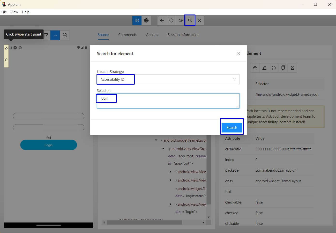 Open the Search for element pop-up by clicking on the magnifying glass icon. Here, select “Accessibility ID” from the Locator Strategy drop-down and type “login” in the Selector field. Then, click on the Search button.