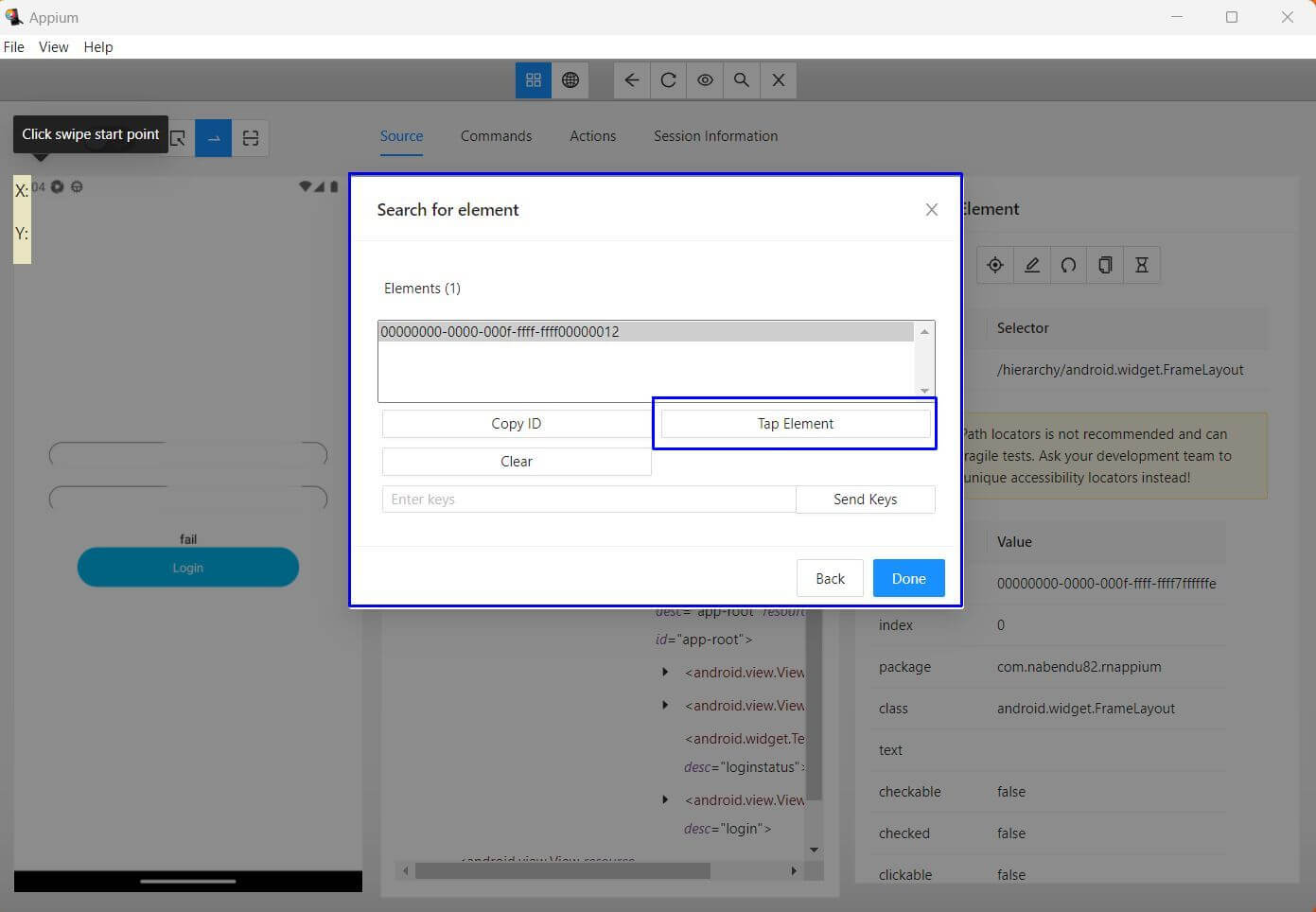 Again, we can also click on Tap Element, and this will actually activate the Login button in our emulator.