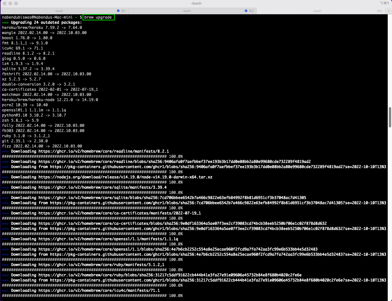 On scrolling down a bit, you’ll see that a lot of packages are not upgraded, so it asks you to run brew upgrade command, which updates all the packages.