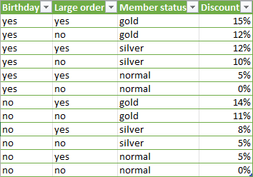 It contains the data for a discount calculation routine. The decision table is much clearer than summing this up in a long specification text. Both developers and testers can use it to implement and test the system. The tester can identify the necessary test cases without looking at the implementation.