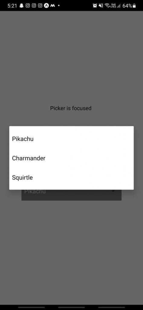 Inside the handleValueChange function, we get the itemValue, which indicates the selected value of the picker option. We also get the itemIndex, based on the sequence of rendered picker items. Inside the above handleValueChange function, we simply set the itemValue to our pokemon state using the setPokemon function.
