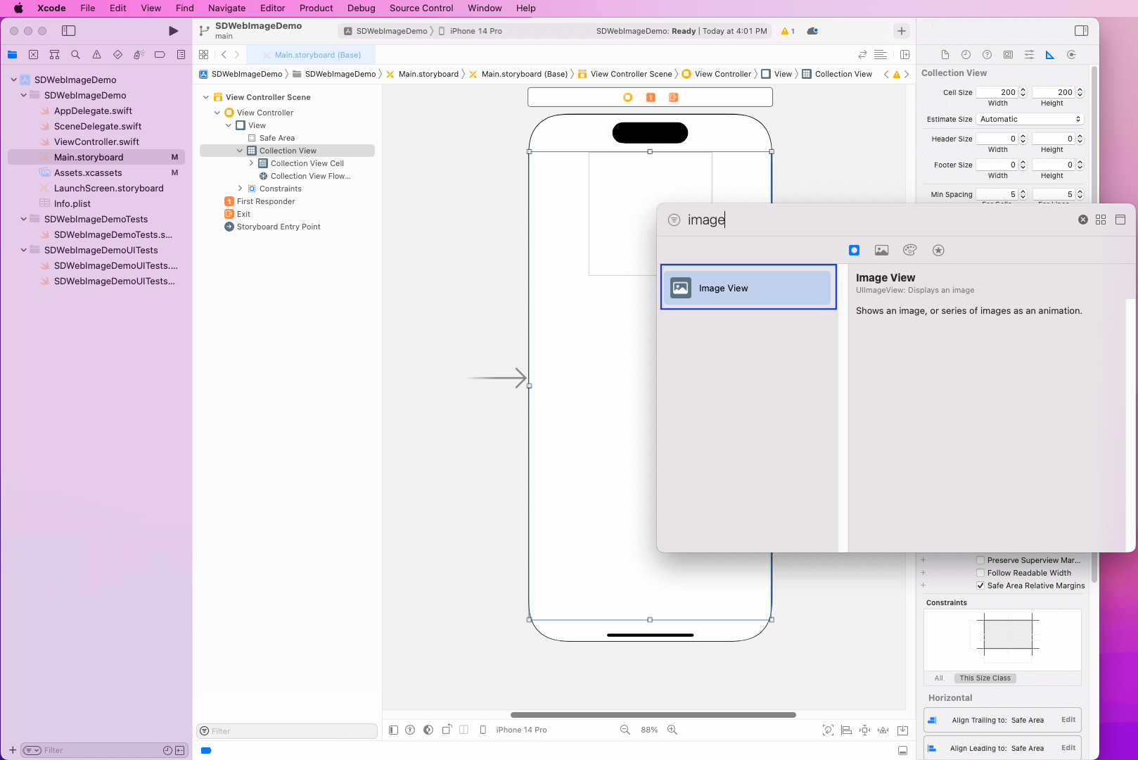 Again, open the object library by clicking the + sign and search for “Image View.”