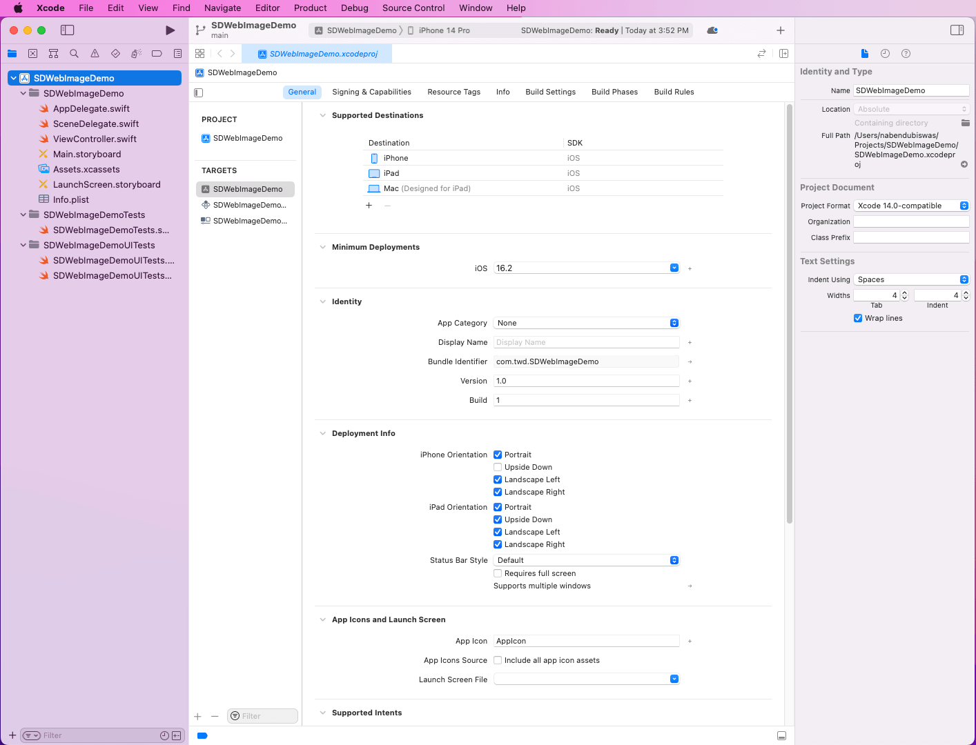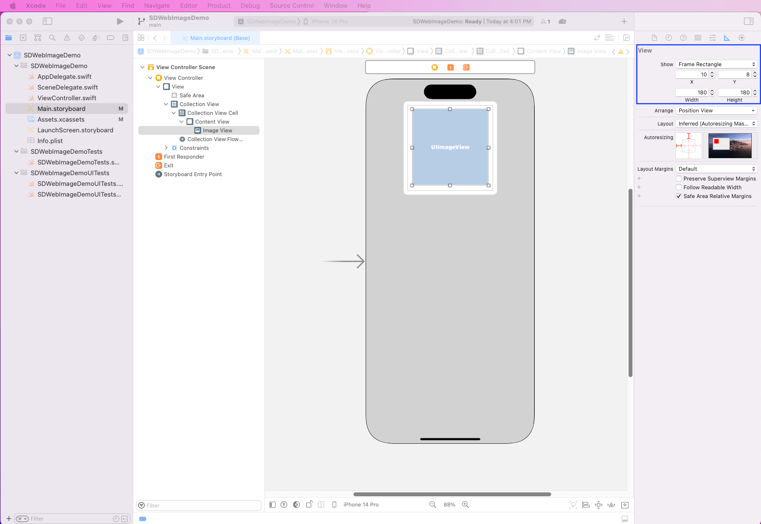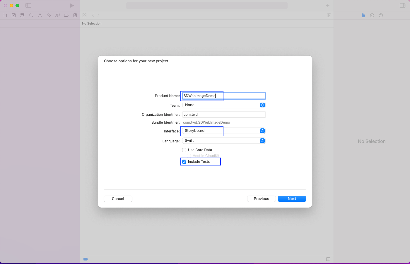 Now give the product a name, SDWebImageDemo. The interface should be Storyboard as we’ll use Storyboard to create our simple app. Also, select the checkbox for “Include Tests” since we’ll write tests in our app.
