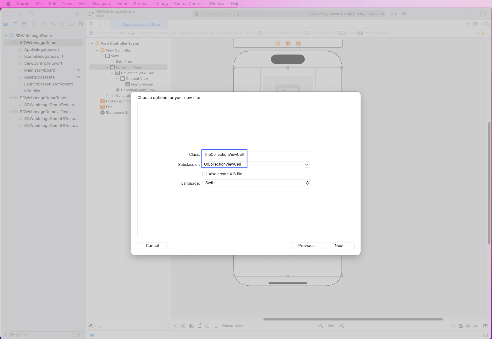 A new Cocoa class file called TheCollectionViewCell.swift will be created.