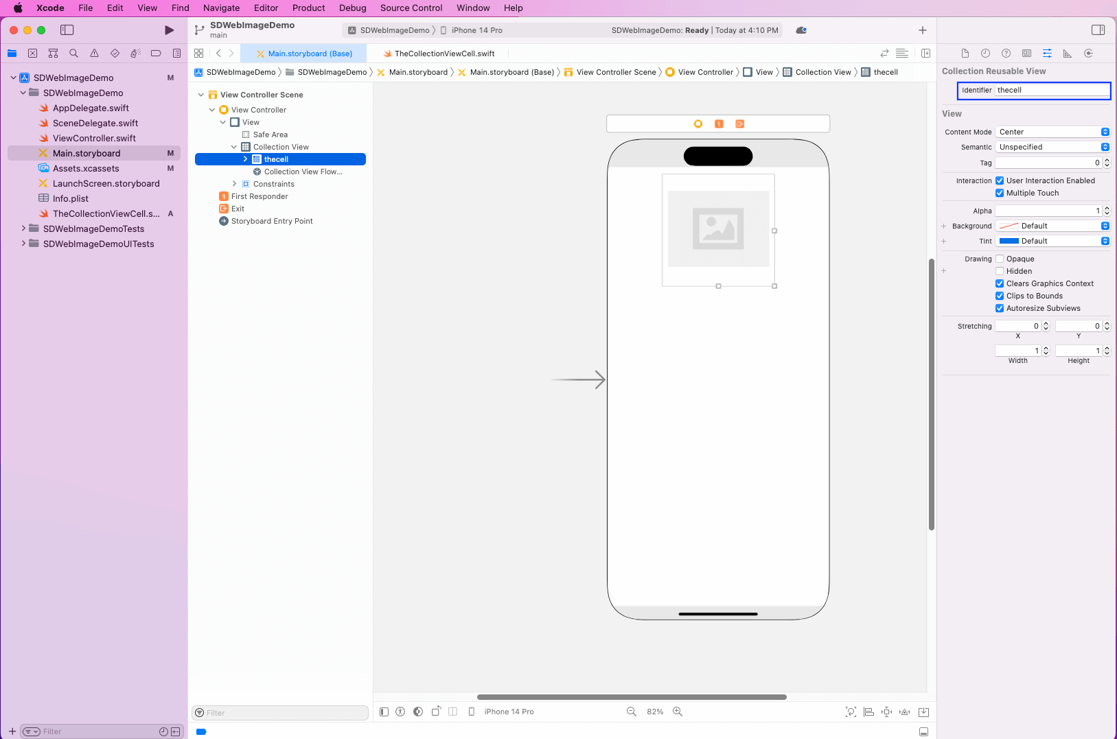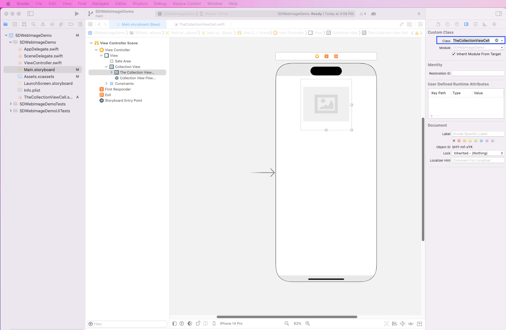 Back in the Main.storyboard file and in The Collection View, make the class TheCollectionViewCell.