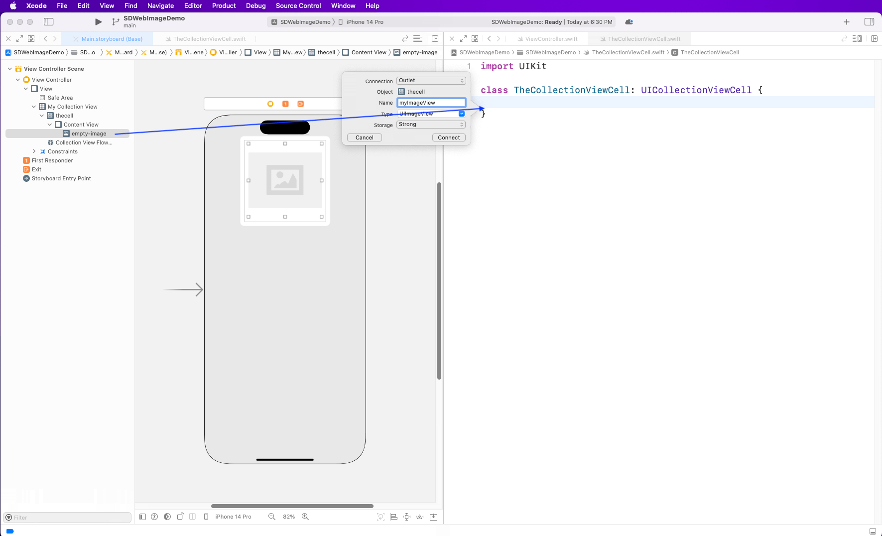 With the TheCollectionViewCell.swift file open on the other screen, drag empty-image to this file, and it will open a pop-up. Give it a name: myImageView.
