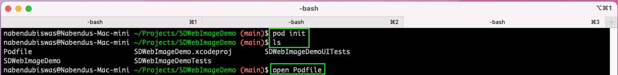 Next, from the project directory, type the pod init command. After that, the output of the ls command should show us the Podfile. Open the Podfile by typing the open Podfile command.