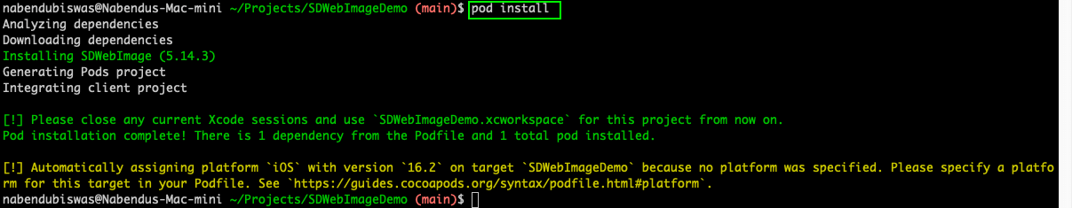 From the terminal, type the pod install command to install the package.