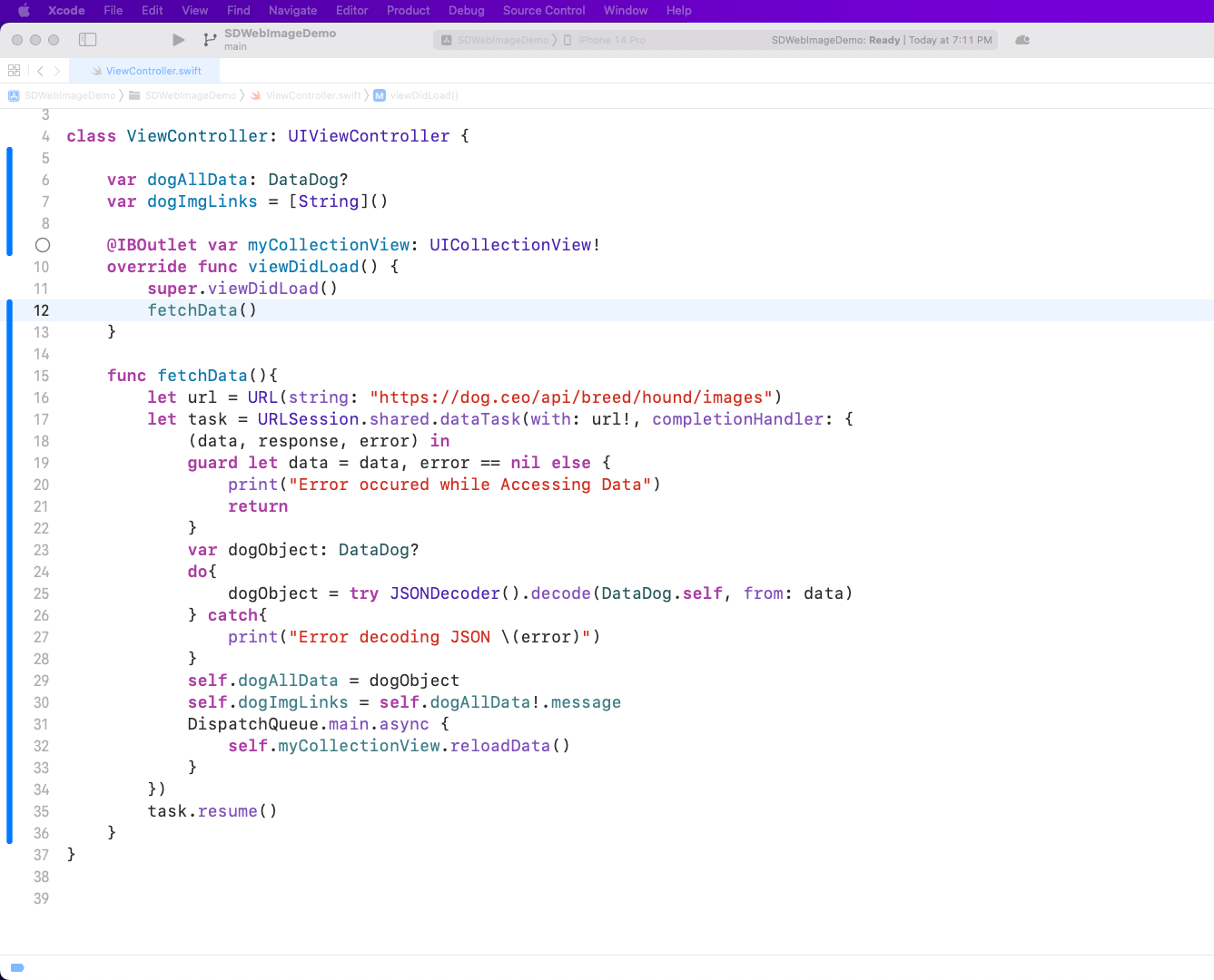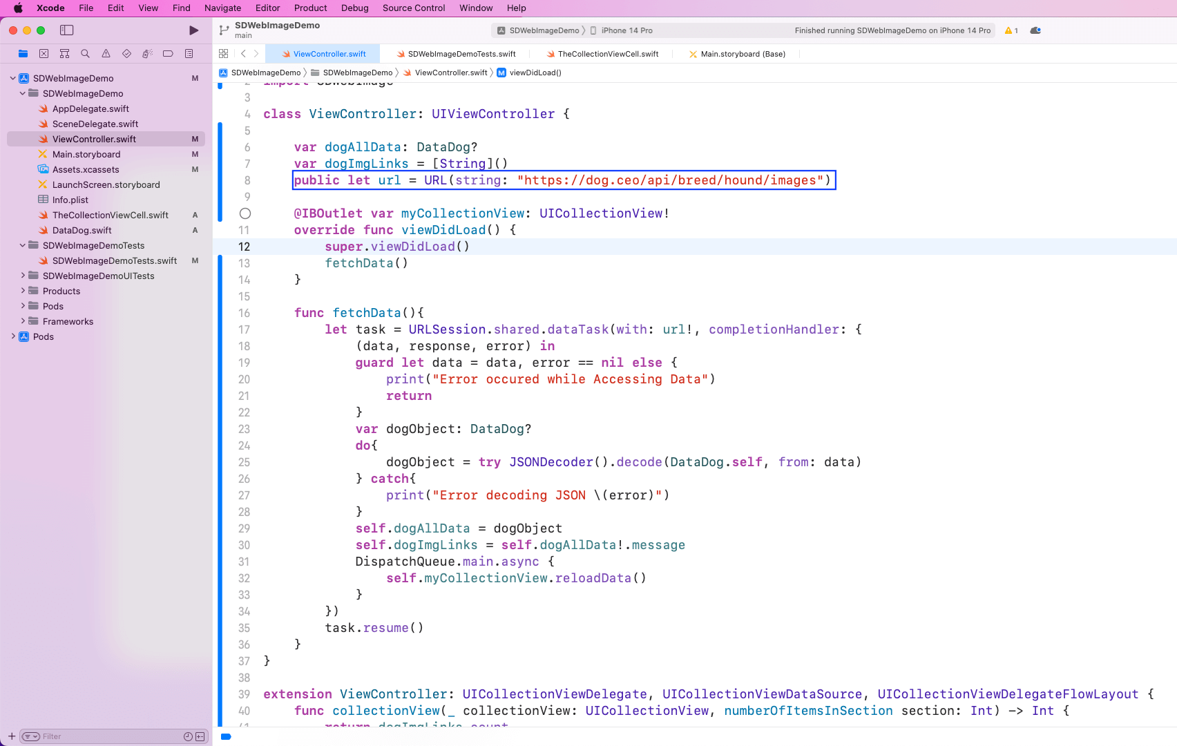 Now, in the ViewController.swift file, put the logic to hit the API endpoint and store it in the variables. Here, we have two variables, dogAllData and dogImgLinks. Next, we’ll call a function called fetchData() from viewDidLoad().