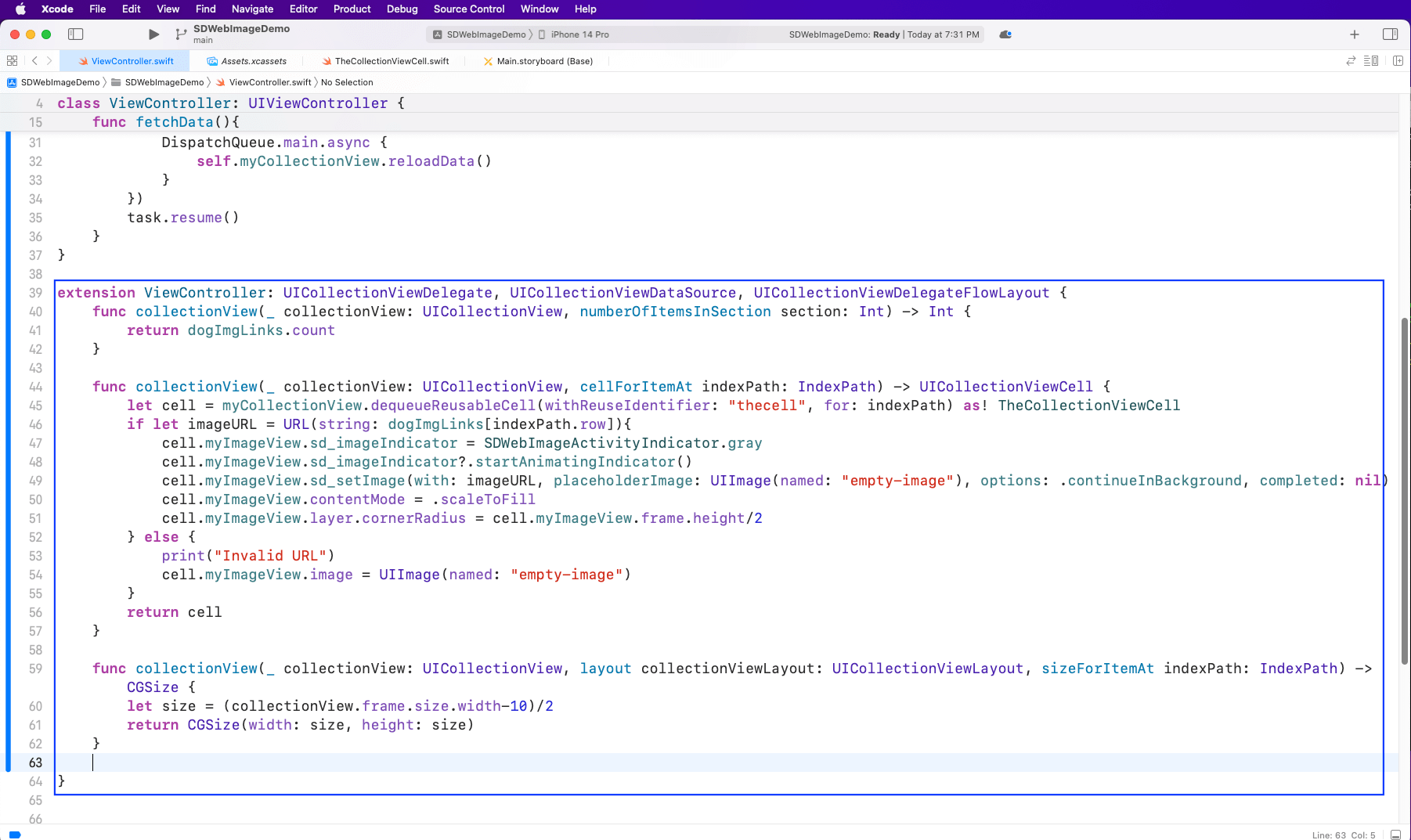 Now create an extension for ViewController. The first collectionView function is required to get the number count of the images. In the next collectionView function, we’ll get the cell with the identifier thecell.