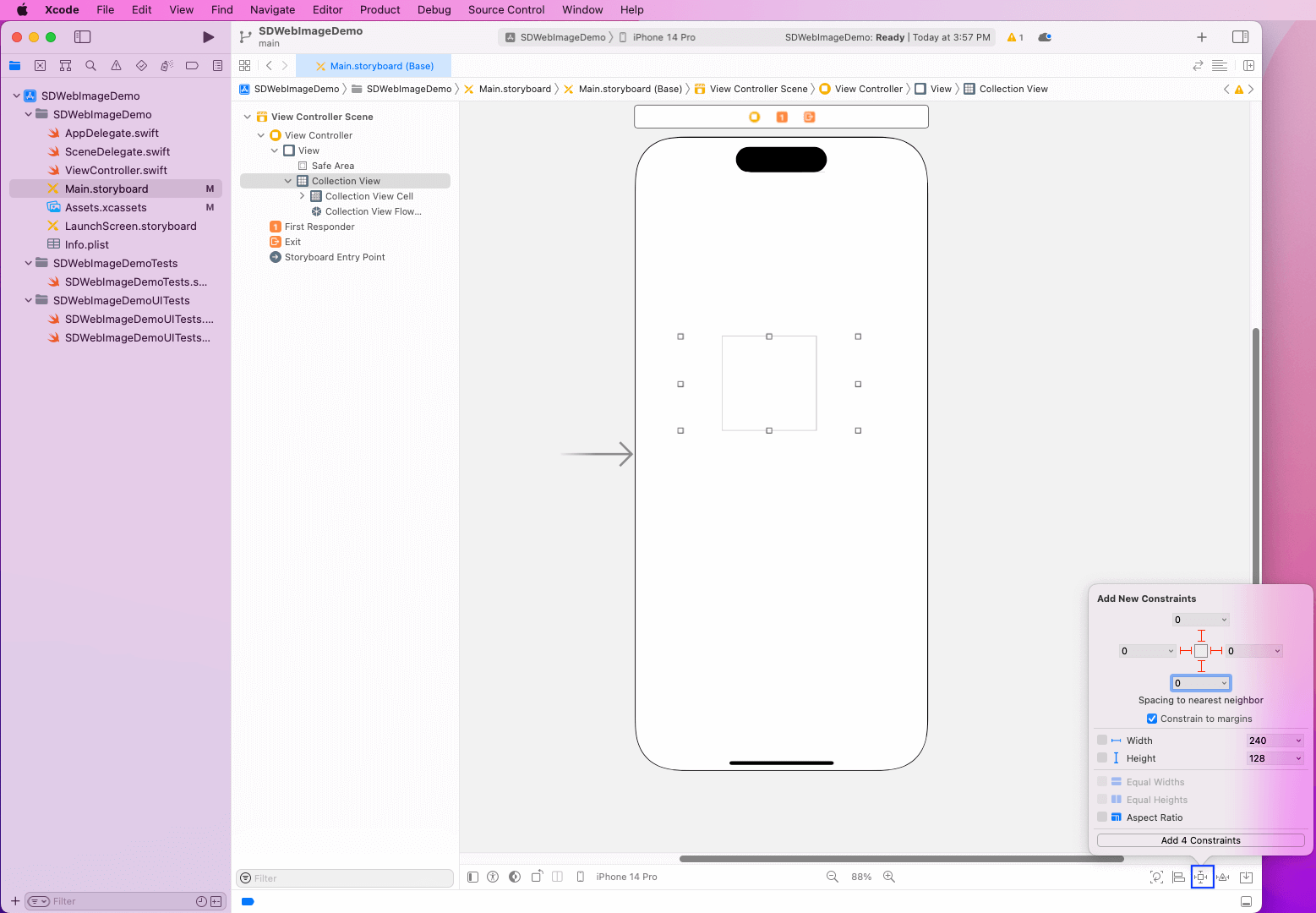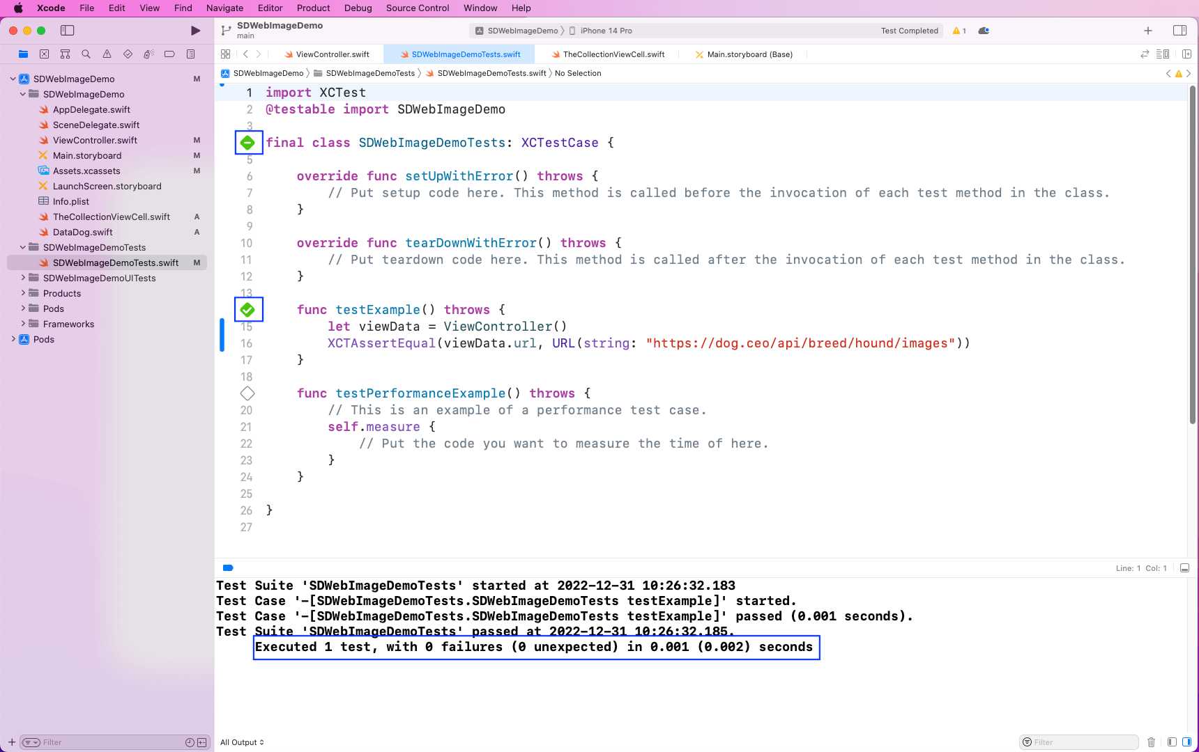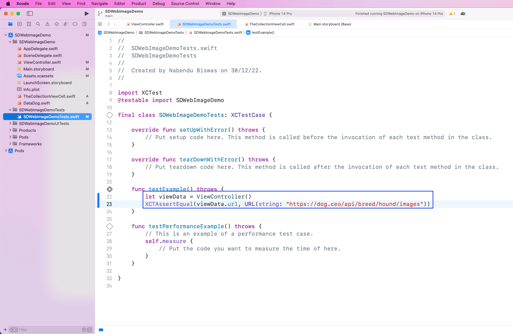 Since we already set up tests when creating the project, just go to the SDWebImageDemoTests.swift file inside the SDWebImageDemoTests folder. Here, we’ll create an instance of ViewController. After that, using the XCTAssertEqual function, we’ll check whether the URL is equal to https://dog.ceo/api/breed/hound/images.