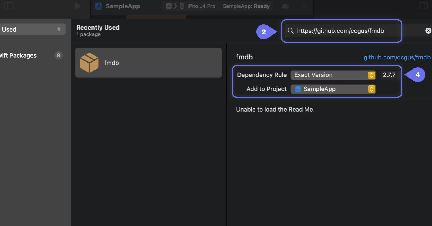 - In Dependency Rule, select Exact Version and then enter version 2.7.7. This locks the version of FMDB to the same one used in this article.