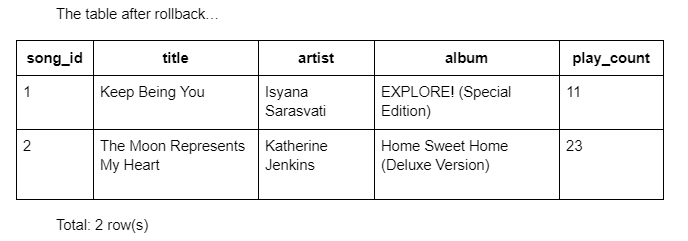 In contrast, you’ll see the following table after rollback. Notice that the song Keep Being You has its play_count value reverted to 11.
