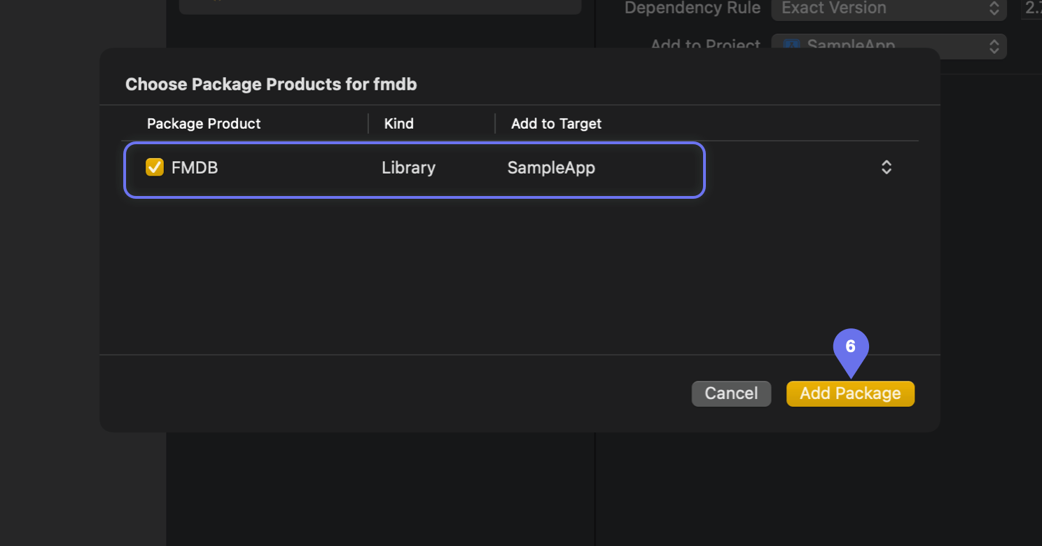 - In the Choose Package Products for fmdb dialog, add the FMDB package product to your app target(s), and then click Add Package.