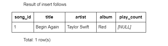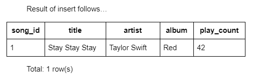 Let’s define a method to populate the songs table for our examples in this section. This time it fills the table with two songs from different albums and their respective play counts.