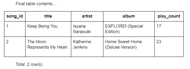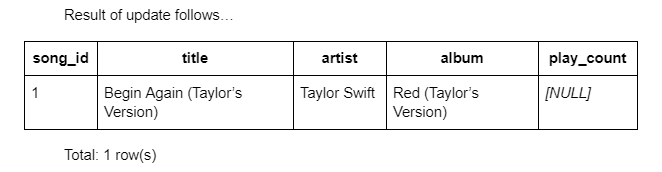 Running the code snippet above shows that the play_count column has been updated correctly.