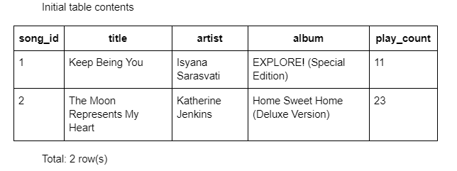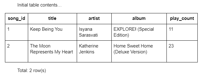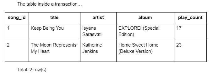 The following table depicts what it looks like during the transaction. Notice that the song Keep Being You has an updated play_count of 17.