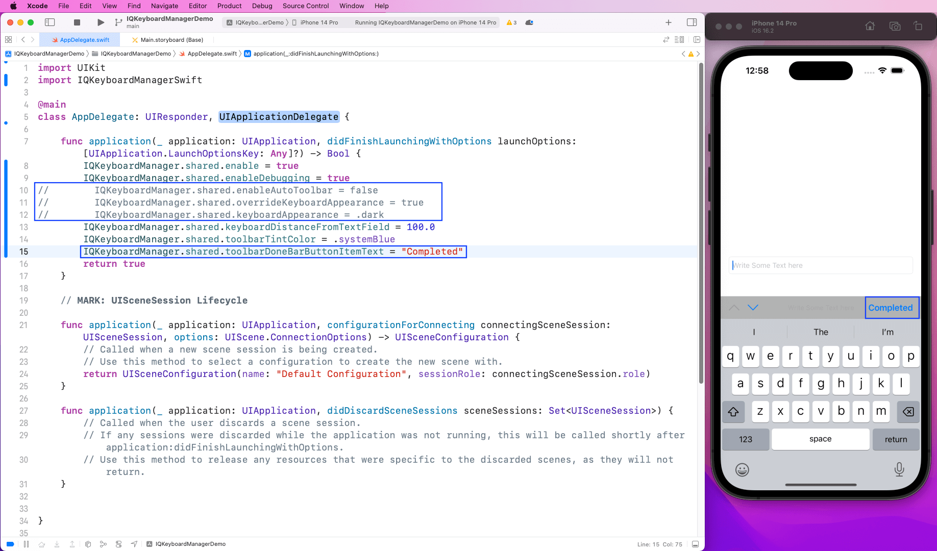 Next, in the AppDelegate.swift file, we’ll import IQKeyboardManagerSwift first. Then, add the line below inside the function application to enable it.