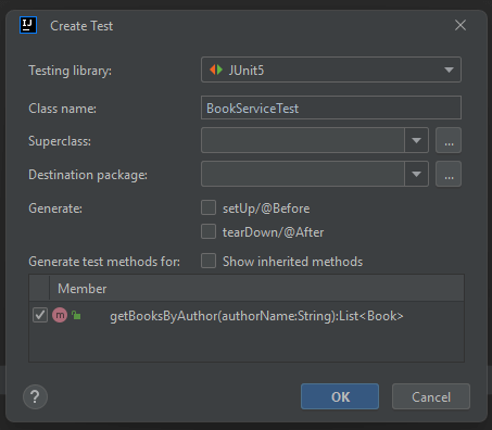 I’ll then select JUnit5 as the test framework, confirm BookServiceTest as the name for the class, and select the getBooksByAuthor() method for the test generation: