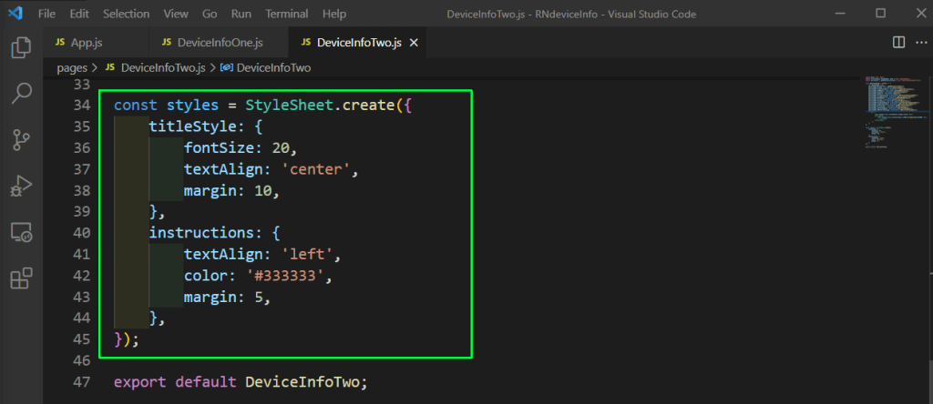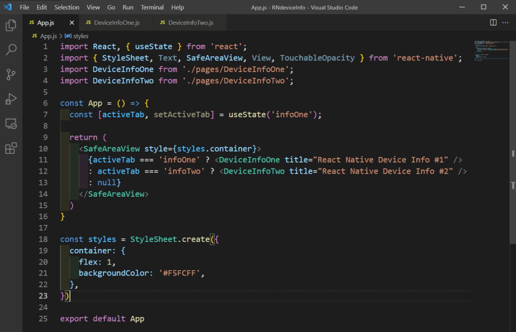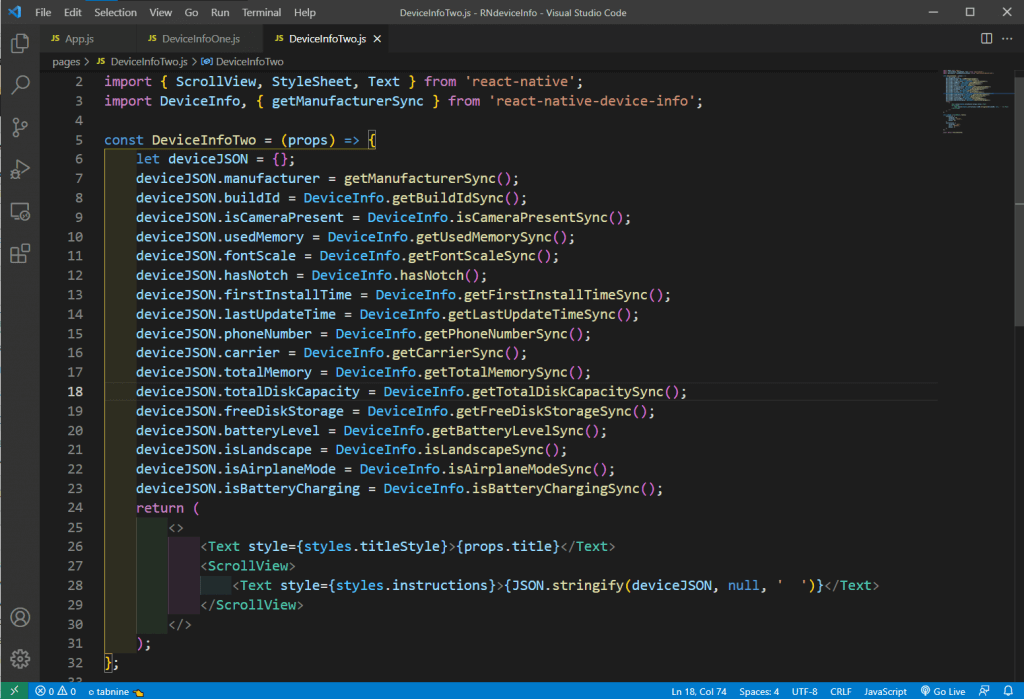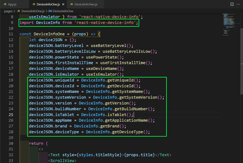 Next, in the file DeviceInfoTwo.js, we’ll add more content to show various device info. We’re first doing the required imports, which include various functions from react-native-device-info.