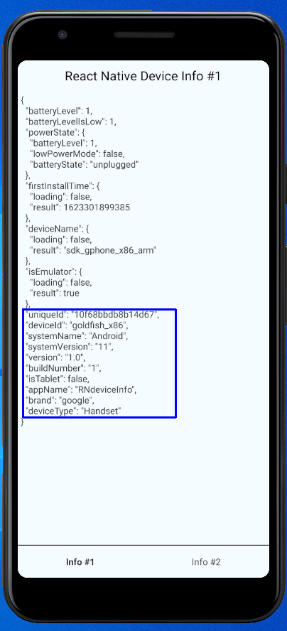 - useIsEmulator: Shows whether the application is running on an emulator. It is true in our case.