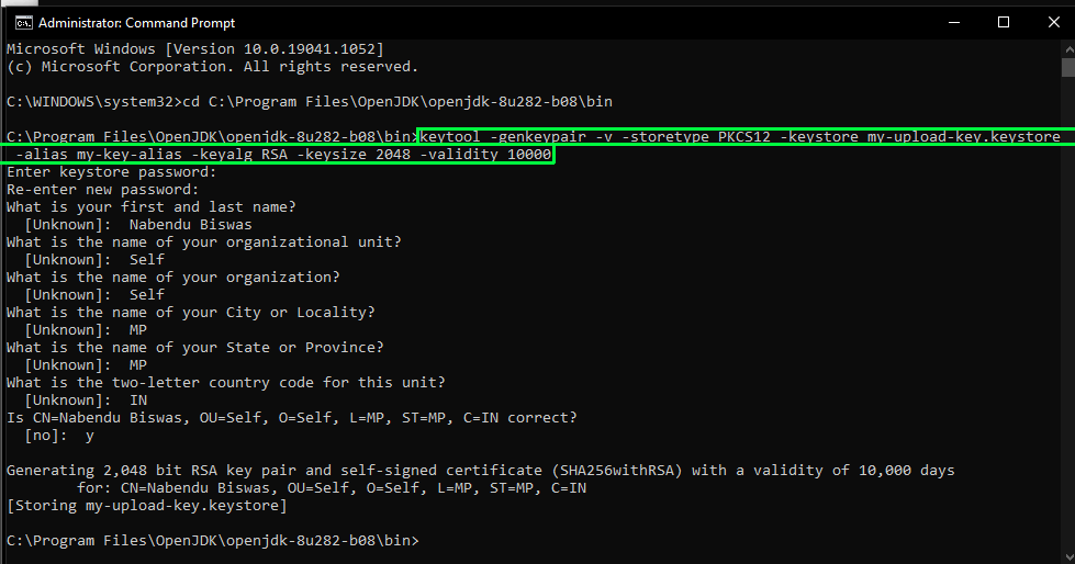 First, we need to generate a signing key using the keytool in Windows. This tool is in the JDK directory of the computer. When we run the keytool command, it will ask us some questions, as seen in the image below. We’ll need to remember the password we have entered, as it will be required soon.