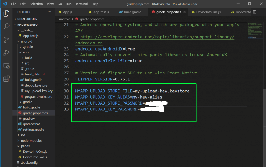 In the file gradle.properties, which is inside the android folder, we need to add the below variables. The password should be the same one we gave earlier.