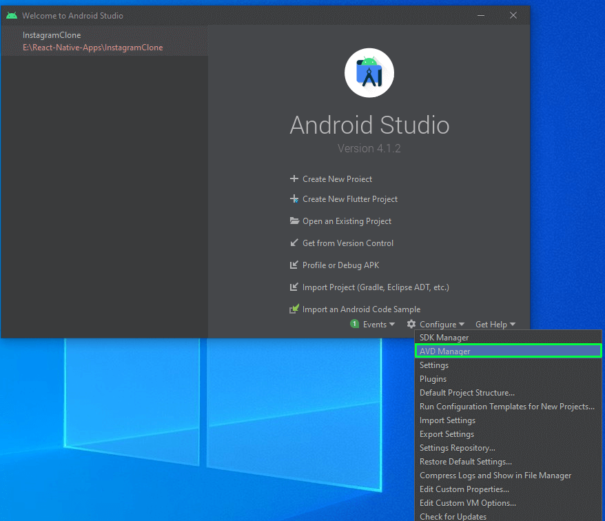 Before starting the project, open Android Studio and click on “Configure.” It will open a pop-up in which you’ll click on “AVD Manager.”