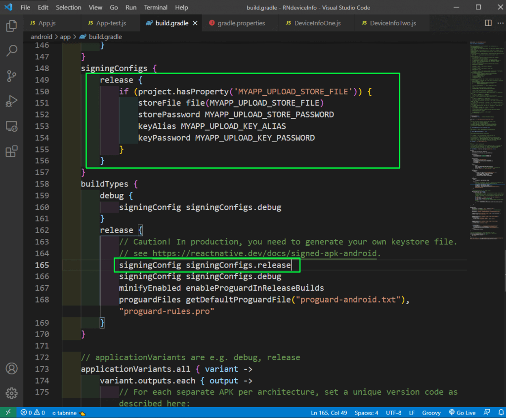 We also need to update the build.gradle file in the android/app folder. In this file, we’ll add the signing configs.