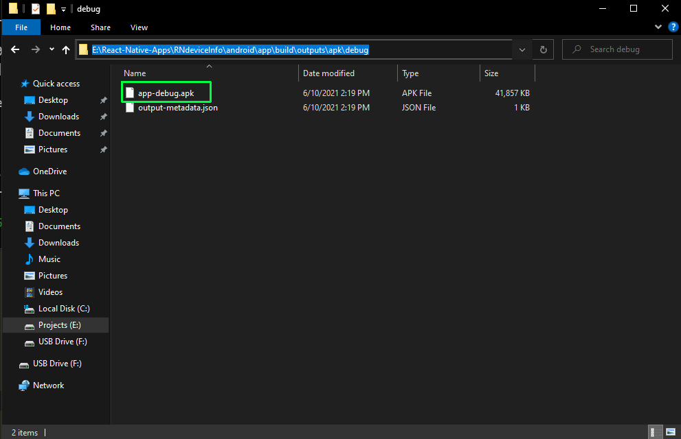 The APK file will be generated in the RNdeviceInfo\android\app\build\outputs\apk\debug folder.