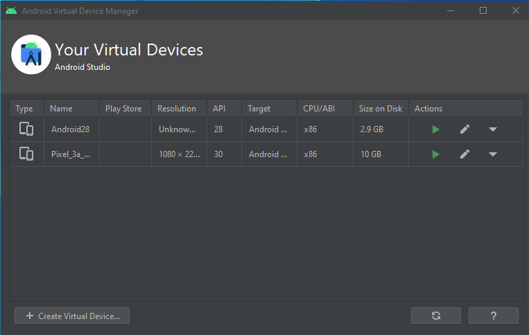 The connected virtual devices configured earlier will be shown. Click on the green play button next to any device.