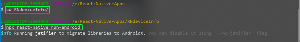 Now, we’ll start our React Native project by first navigating to the directory and running the npx react-native run-android command.