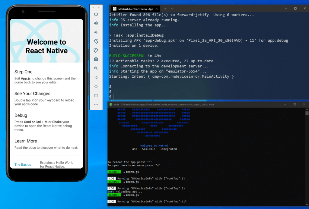 It will show that the build is successful in the same terminal. And another terminal will open for the React Native CLI. We’ll also get the output of the default app on our Android emulator.
