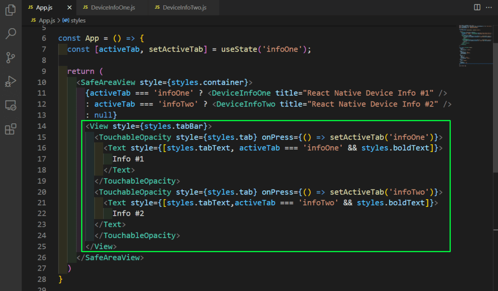 Next, we’ll add a tab bar inside our SafeAreaView. It will contain two TouchableOpacity elements with text in them. Notice that we’re changing the activeTab state based on the click of the tab. So, with this logic, the component DeviceInfoOne or DeviceInfoTwo will be opened.