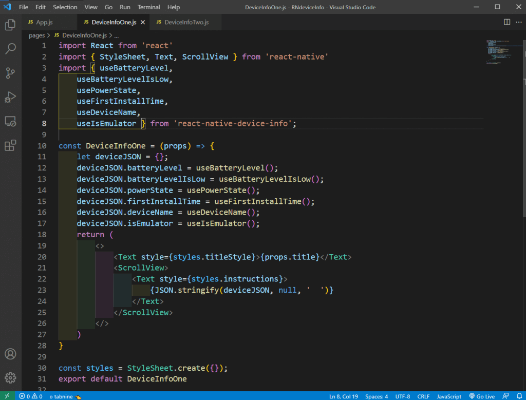 In the file DeviceInfoOne.js, we’ll add the content to show various device info. We’re first doing the required imports, which include various functions from react-native-device-info.