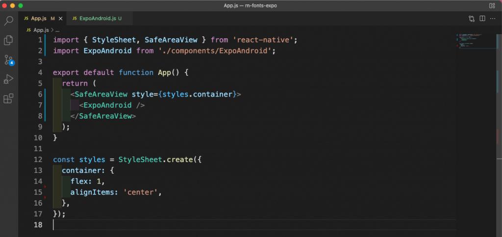 Next, in the App.js file, remove all earlier content. Here we are importing and displaying a component of ExpoAndroid.