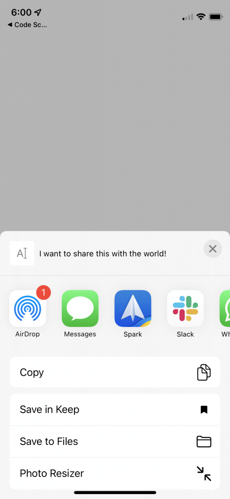 As you can see, this code only provides a simple string of text to the share feature, “I want to share this with the world!” However, you can also provide a title and url to the share feature, although the url option is only available for iOS.