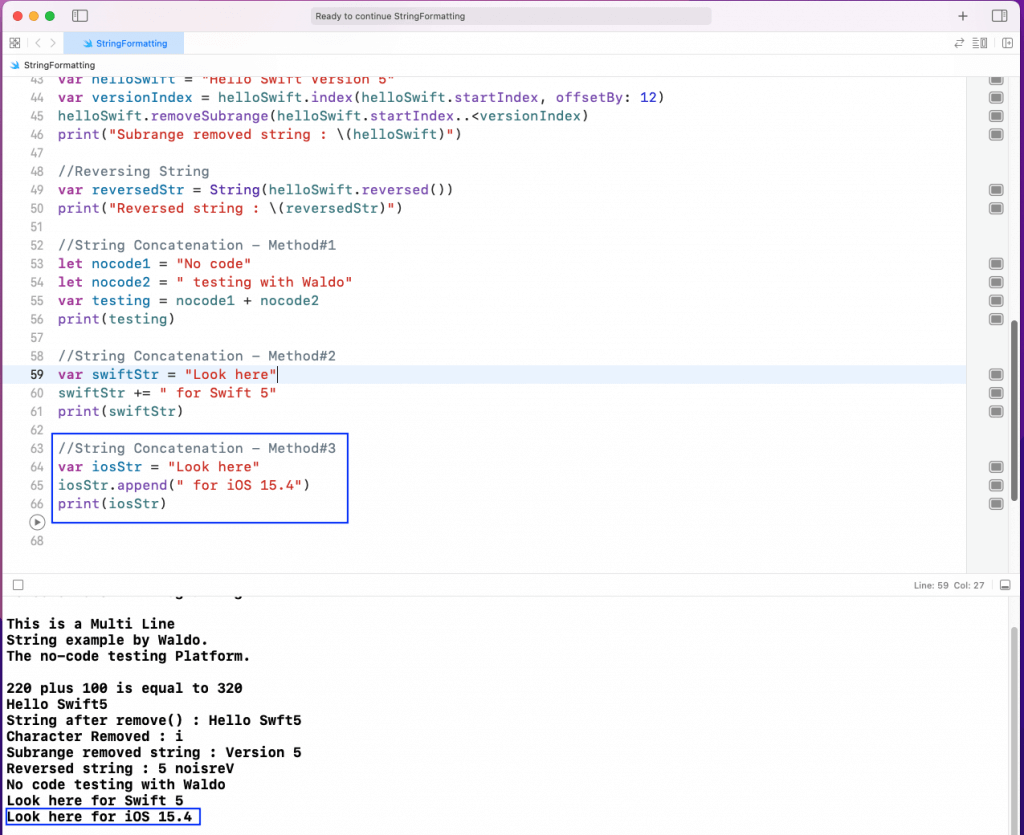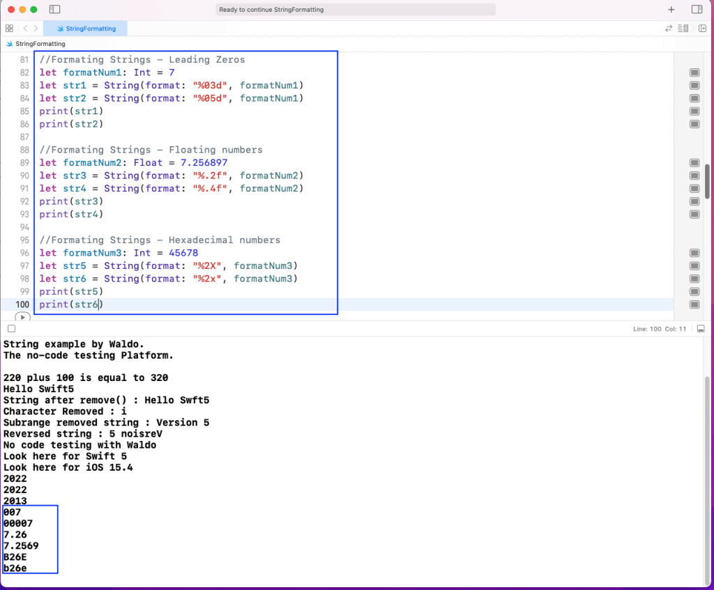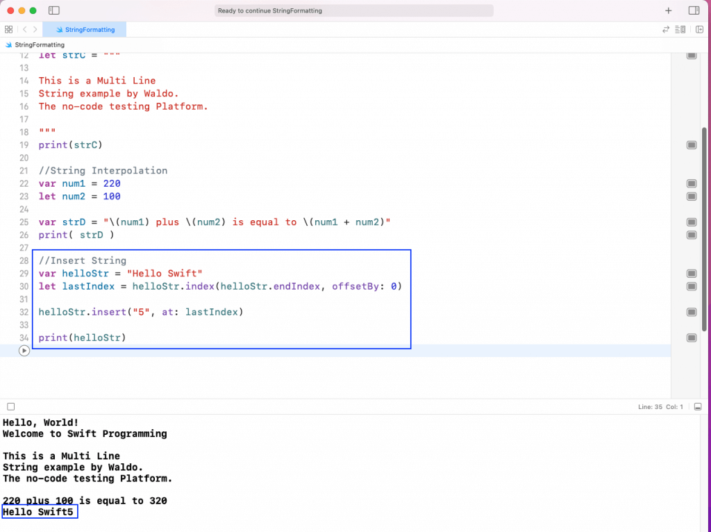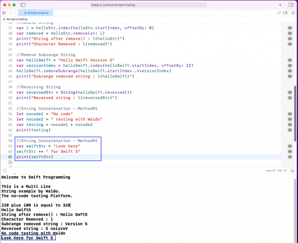 As shown in the output, the swiftStr string contains the text Look here for Swift 5.