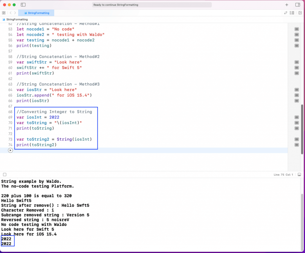 Notice that in the first, we’re just giving the string inside double quotes. And in the second, we’re giving it inside the String() class. Add the below code in the playground: