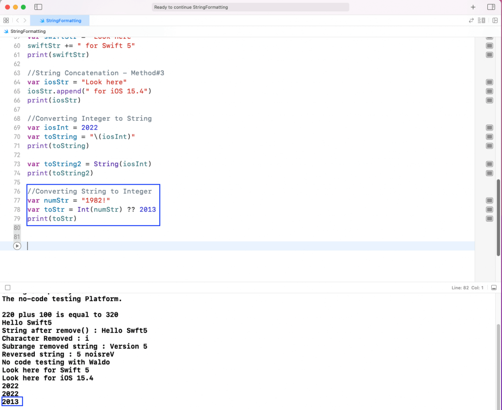 In the below example, our string is 1982!. So, while converting it, we should always use the optional of ??. And we should give an optional value or else the Swift program could crash.