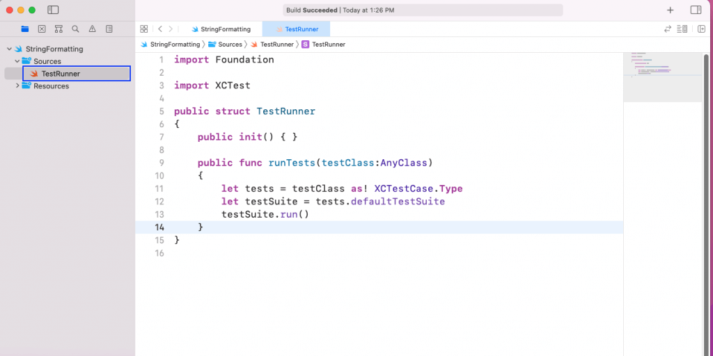 First, create a file called TestRunner in the Sources folder and add the below code in it. Here, after doing the required imports, we need to write a structure called TestRunner. Inside it, the code specifies that it will run all test suites.