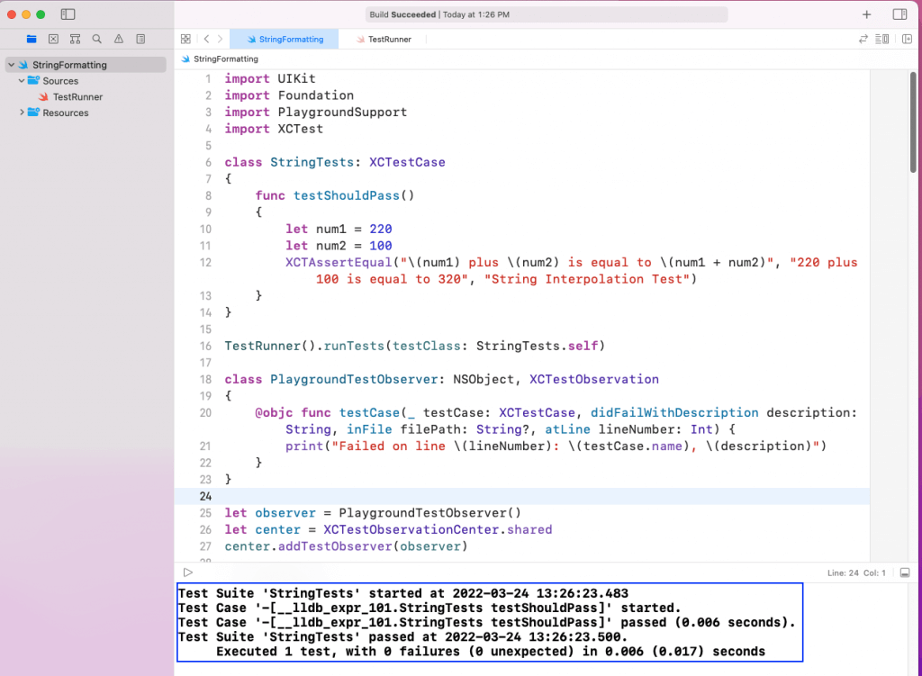 The code for PlaygroundTestObserver is required to run the test cases in the playground. Lastly, when we run the file, it will show the test case to be successful.