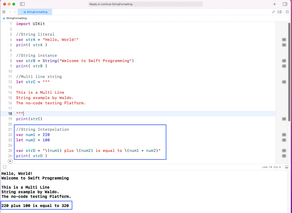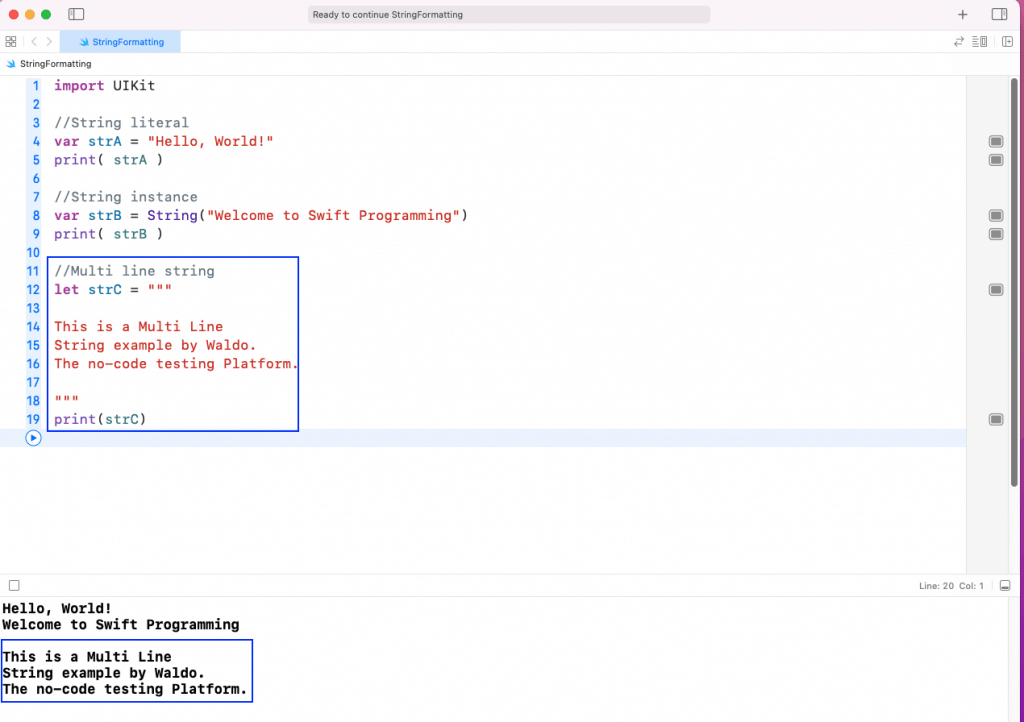 We create a string in Swift using a String literal or String class instance. In the playground, we’ll create two strings using literal and instance and print them.