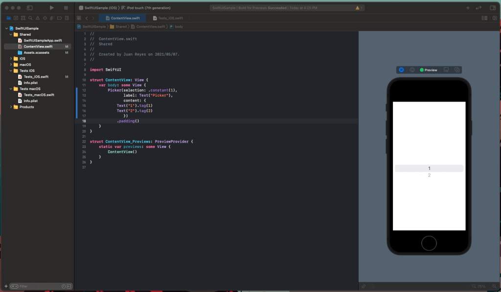 To do that, let’s embed the Picker in a VStack and add a Text that will indicate the selected value. Then, let’s add a @State variable that will persist the selected value index.