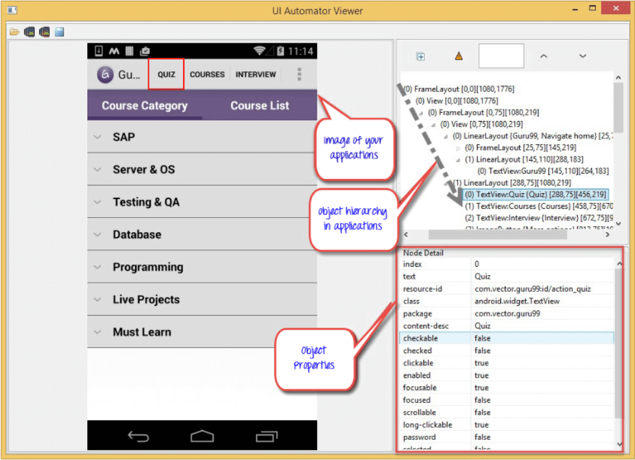 In the example below, you can see how the hierarchy of views is structured in the system. UIAutomatorViewer lets you examine the object properties to see everything going on behind the scenes.