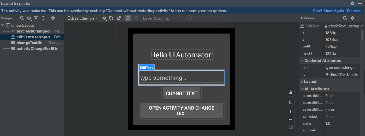 Here is where you will make use of the UIAutomatorViewer, or the Layout Inspector, if you’re using Android Studio IDE, to see the properties of the elements in the project.