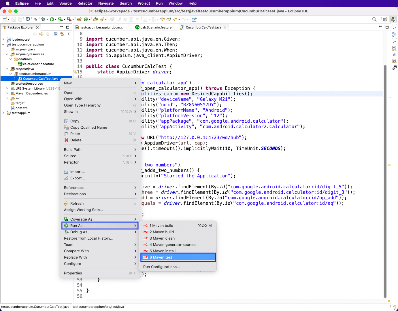 Now, back in the project, right-click on the CucumburCalcTest.java file. Then, click on Run As > Maven test.